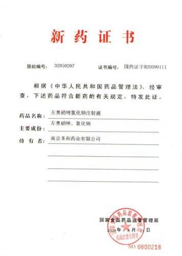 2009年8月15日,我公司具有5項(xiàng)國家發(fā)明專利、2項(xiàng)歐美專利的創(chuàng)新藥左奧硝唑原料及氯化鈉注射液制劑獲國家食品藥品監(jiān)督管理局國家一類新藥證書及生產(chǎn)批件。
