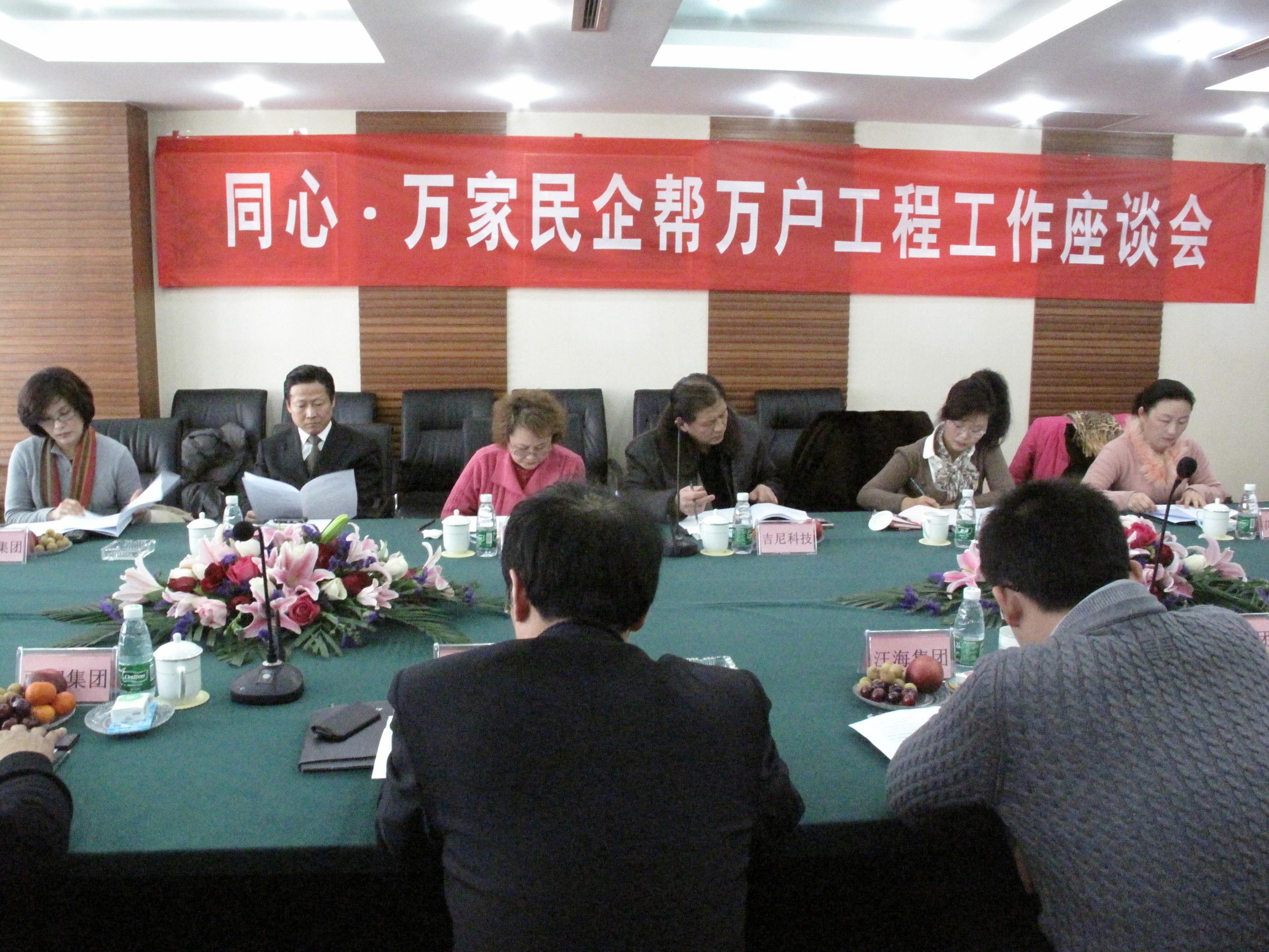 本網(wǎng)訊 為充分發(fā)揮非公有制企業(yè)在南京市幸福都市建設(shè)和率先基本實(shí)現(xiàn)現(xiàn)代化中的積極作用,全市統(tǒng)一戰(zhàn)線將組織萬(wàn)家非公有制企業(yè)幫扶萬(wàn)戶特困家庭,開(kāi)展“同心·萬(wàn)家民企幫萬(wàn)戶工程”活動(dòng)。2月7日,南京市委統(tǒng)戰(zhàn)部“同心·萬(wàn)家民企幫萬(wàn)戶工程”工作座談會(huì)在圣和集團(tuán)總部召開(kāi)。南京市工商聯(lián)副主席李冰、南京市委統(tǒng)戰(zhàn)部經(jīng)濟(jì)處處長(zhǎng)鄭德巍、南京市工商業(yè)聯(lián)合會(huì)經(jīng)濟(jì)處處長(zhǎng)錢衛(wèi)冰,以及雨潤(rùn)集團(tuán)、圣和集團(tuán)、商貿(mào)集團(tuán)、汪海集團(tuán)、晨林商貿(mào)、飛元集團(tuán)、易記小吃店、吉尼科技、新葉時(shí)裝、花旗涂料等企業(yè)負(fù)責(zé)人參加會(huì)議。