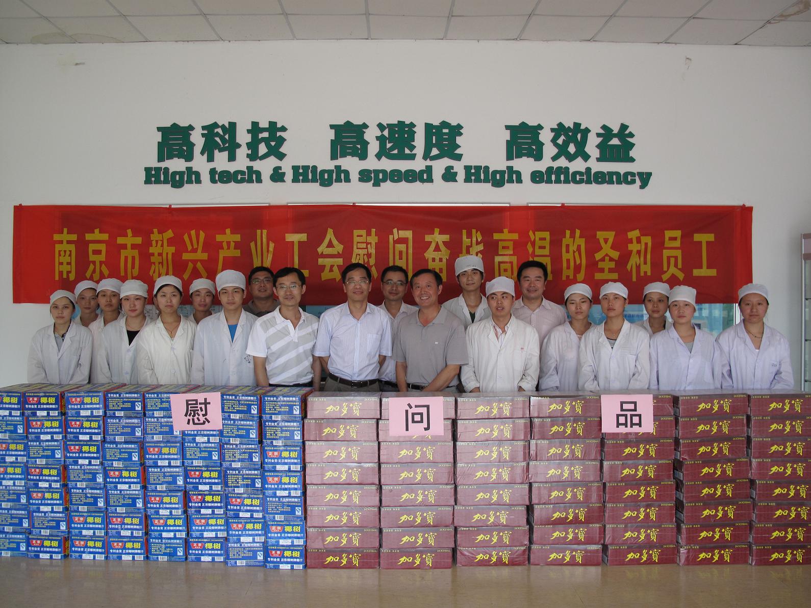 慰問現(xiàn)場,新興產(chǎn)業(yè)工會(huì)郎主席看到同志們還堅(jiān)持奮戰(zhàn)在生產(chǎn)一線,非常感動(dòng),他代表南京市工會(huì)向大家表達(dá)了親切的關(guān)懷和誠摯的慰問,同時(shí),他鼓勵(lì)大家再接再厲,戰(zhàn)勝高溫,確保安全,穩(wěn)定生產(chǎn)。隨后,新興產(chǎn)業(yè)工會(huì)領(lǐng)導(dǎo)和集團(tuán)工會(huì)領(lǐng)導(dǎo)共同給員工代表送上了清甜的防暑降溫飲品。