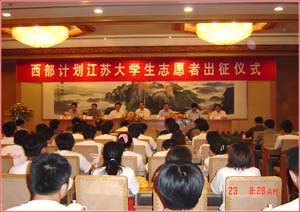 2003年8月23日上午,團省委、省教育廳、省財政廳、省人事廳聯合舉行江蘇大學生志愿服務西部計劃出征儀式,歡送我省415名大學生志愿者赴陜西、廣西、云南三省區(qū)貧困地區(qū)鄉(xiāng)鎮(zhèn)基層從事為期1—2年的教育、衛(wèi)生、農技、扶貧等方面的志愿服務。省委副書記馮敏剛,省委常委、組織部長徐國健,副省長吳瑞林出席了儀式。