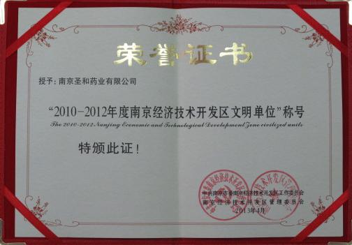 近日,南京經(jīng)濟(jì)技術(shù)開發(fā)區(qū)下發(fā)《關(guān)于表彰2010-2012年度南京經(jīng)濟(jì)技術(shù)開發(fā)區(qū)文明單位的決定》,授予南京圣和藥業(yè)有限公司“2010-2012年度南京經(jīng)濟(jì)技術(shù)開發(fā)區(qū)文明單位”榮譽(yù)稱號并頒發(fā)證書。