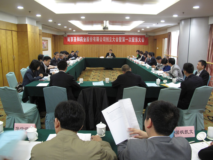 本網(wǎng)訊 4月29日,南京圣和藥業(yè)股份有限公司創(chuàng)立大會(huì)在國(guó)信大酒店隆重召開(kāi)。36名股東(本人/股東代表/委托代理人)悉數(shù)參會(huì),代表公司有表決權(quán)的股份40000萬(wàn)股,占公司總股份的100%。王勇董事長(zhǎng)主持會(huì)議,公司董事候選人、監(jiān)事候選人、高級(jí)管理人員候選人均出席了會(huì)議。華泰聯(lián)合證券項(xiàng)目負(fù)責(zé)人張雷及律師事務(wù)所、會(huì)計(jì)師事務(wù)所項(xiàng)目負(fù)責(zé)人等嘉賓列席會(huì)議。