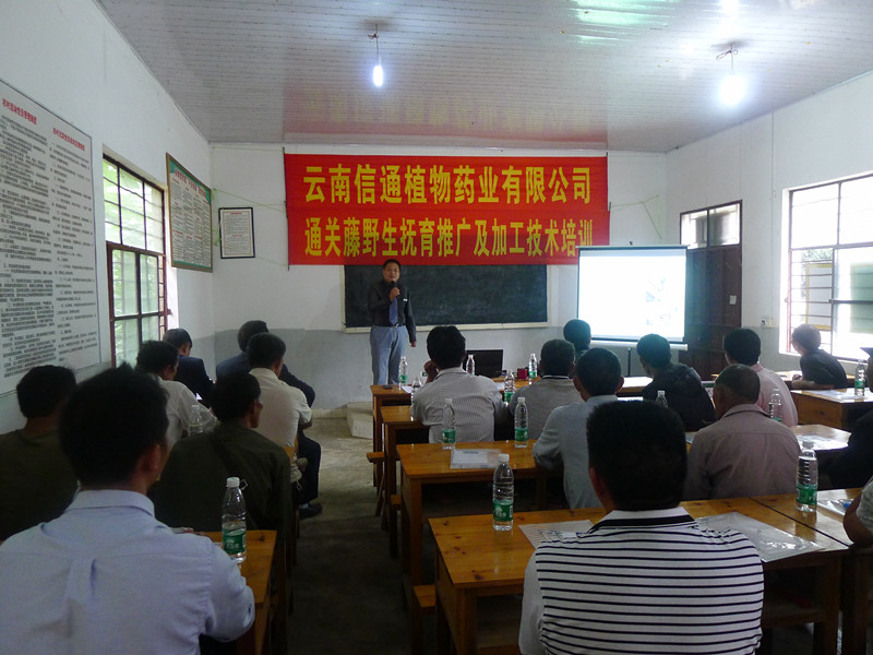 本網(wǎng)訊 8月25日,云南信通植物藥業(yè)有限公司生產(chǎn)技術(shù)部應(yīng)斗咀通關(guān)藤野生撫育基地負責人及當?shù)剞r(nóng)戶邀請,組織人員至云南文山州馬關(guān)縣進行了通關(guān)藤野生撫育推廣及加工技術(shù)培訓(xùn)。培訓(xùn)會議得到了當?shù)卣块T和農(nóng)戶的積極配合和大力支持,馬關(guān)縣科協(xié)主席及秘書,坡腳鎮(zhèn)書記,興隆村支書、村長,各村小組組長、農(nóng)戶等近40人參加了培訓(xùn)。